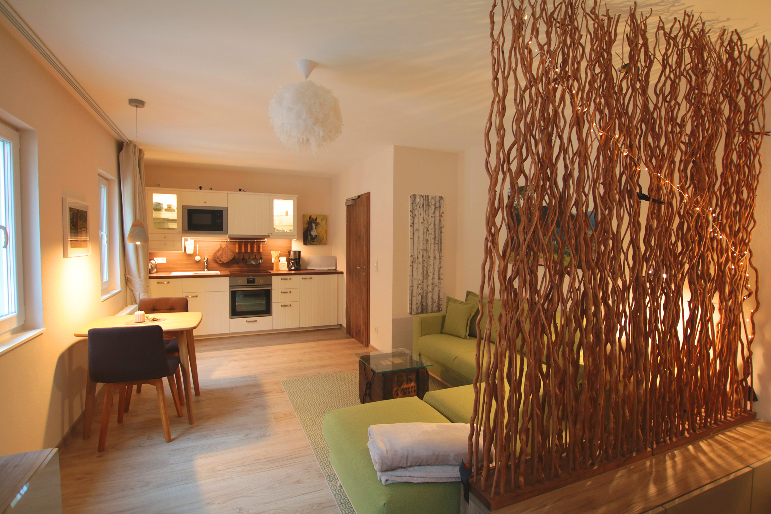 Helles Apartment (38 qm) mit Schlafzimmer, en-suite-Bad, Wohn-Esszimmer und kompletter Küche.