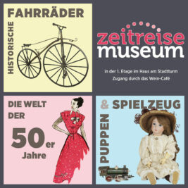 Im „Haus am Stadtturm” finden Sie eine Ausstellung mit historischen Fahrrädern, vom Beginn des Laufrades bis zu Kultdrahteseln sowie eine Sammlung von Puppen, Puppenhäusern & antikem Spielzeug – alles liebevoll restauriert. Einige der Puppenhäuser zeigen originalgetreu die Wohnwelten der wohlhabenden Weinhändler um 1920.